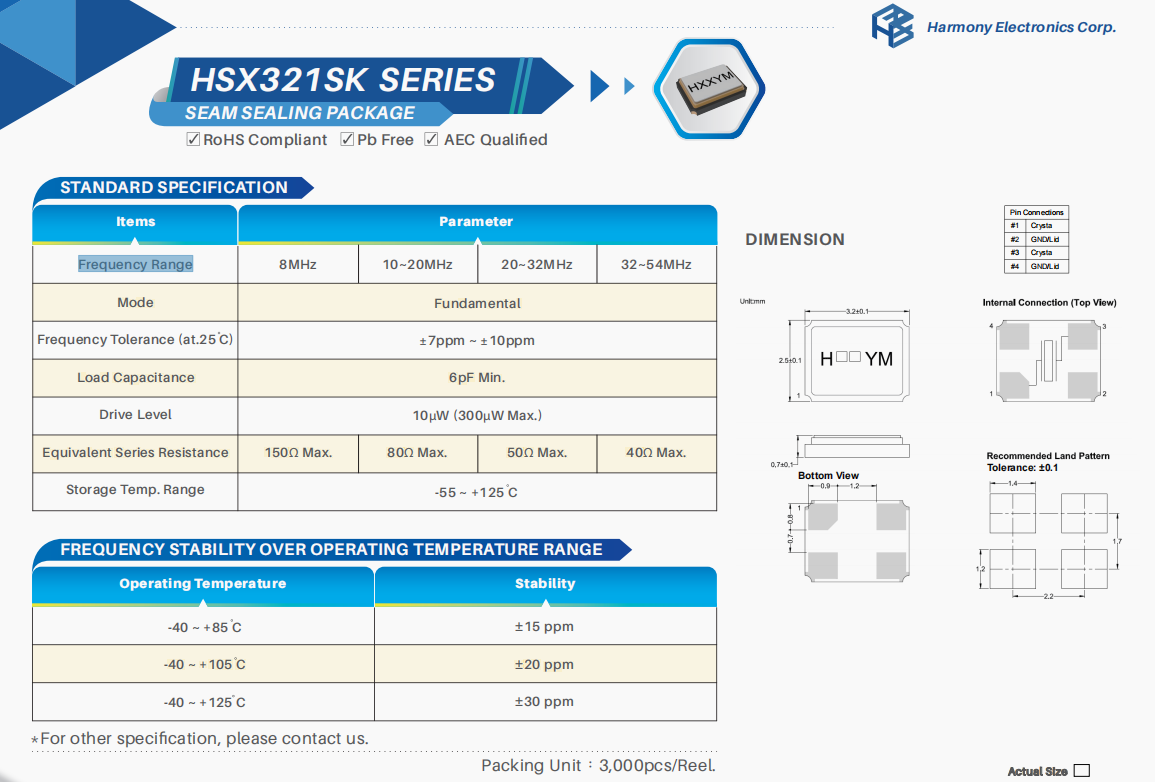 | X3S010000BK1H-X | 加高晶振 | HSX321S | 10 MHz | ±30ppm | 20pF |